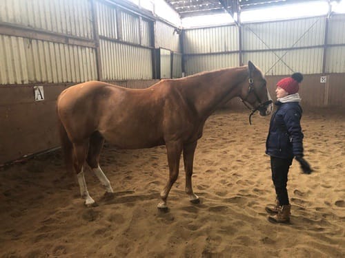 Rebecca a évalué si Timber était confiant dans différentes parties du manège en commençant par la tête, puis la cage thoracique du cheval finalement lui demander d’approcher ses postérieurs du mur à divers endroits.