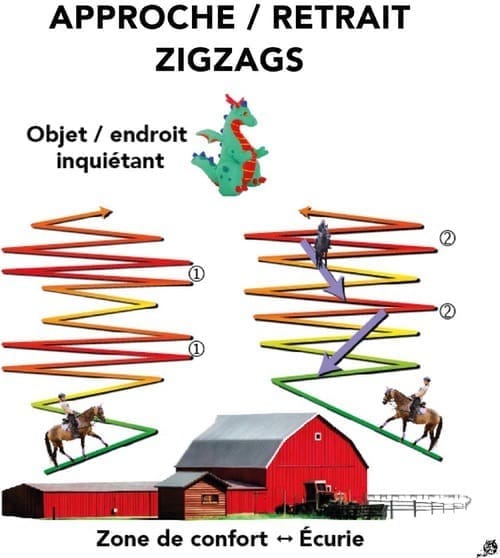 Lorsque le cheval démontre une inquiétude peu importe où vous êtes, ces concepts doivent être appliqués comme par exemple les zigzags qui sont très efficaces pour rassurer le cheval.