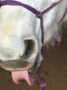 Indy est réputée pour ‘’lick & chew’’ et je leur dis souvent ce n’est pas spécifique à Indy mais au programme : 20% de pression et 80% de relâchement et je lui offre de la variété dans nos activités ce qui stimule son intérêt. Récemment lors du mauvais temps on a monté dans le manège avec une foule de cônes et de barres au sol. On faisait des patrons. Indy montée en licol de corde et après quelques exercices on marchait tranquillement et le ‘’lick & chew’’ était très présent lors de cette phase de relaxation. Il ne faut pas oublier l’importance de la relaxation. Certes que lorsqu’on monte on ne peut pas toujours faire ça mais il ne faut quand même pas oublier d’arrêter de demander constamment. Quelques personnes ont remarqué la différence avec un cheval qui était monté avec un ‘’flash’’, incapable de s’exprimer et Indy montée avec un licol qui lèche abondamment.
