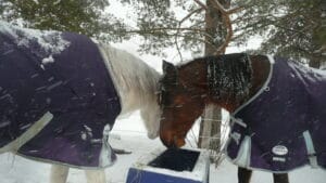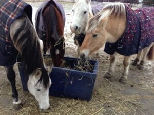 Photos : Frey et Thor les fjords. Indy, Aramis, Sheherazzde et Poney à la mangeoire. Il y en avait deux mais les chevaux mangeaient très souvent ensembles.