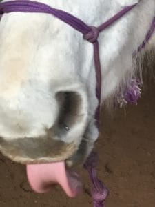 Tout à coup, elle a compris et réussi. Ce qui était vraiment très clair, c’est son niveau de satisfaction suite à la réussite. La langue sortie comme un lézard, oui, ça lui a demandé un effort mental mais la relaxation a suivi démontré par le ‘‘lick & chew’’. Elle était contente et évidemment a eu une friandise pour son succès. L’article ‘’L’importance du ‘’Lick 8 Chew’’ et le pourquoi de la série PARTENARIAT AVEC LE CHEVAL explique bien ce concept.
