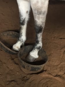 Puis je lui ai demandé, un pied dans chaque plat en pointant son pied gauche à mettre dans le plat à sa gauche. J’ai attendu, corps au neutre, toujours en pointant le pied gauche vers l’autre plat. Il est extrêmement important de laisser du temps au cheval pour qu’il réfléchisse et trouve une solution. Nous, humains, sommes souvent beaucoup trop vite et tentons continuellement de les diriger. Je lui démontre le geste à faire avec la main mais ne touche pas le pied à déplacer car à ce moment ça solliciterait moins son processus de pensée car elle répondrait à la pression du toucher.