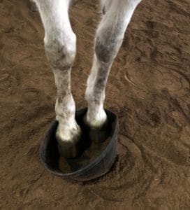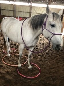 On peut aussi jouer avec des cerceaux et demander au cheval de placer ses pieds dans les cerceaux en s’adressant à chacun des pieds, en pointant puis demandant verbalement ce qui pour le cheval correspond à l’intention. Si ça ne va pas à ce moment on peut toucher le pied en lui indiquant ce qu’on demande.