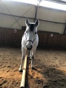 Un challenge un peu plus difficile c’est de demander au cheval de mettre un pied de chaque côté d’une barre au sol, pieds avant ainsi que les pieds arrière.