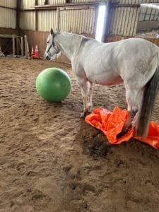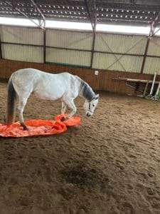 Dernièrement, j’ai eu l’idée d’utiliser ma jument Indy afin d’améliorer la confiance de Freya, une fjord sauvage adoptée par ma propriétaire d’écurie. J’ai commencé à faire du travail à pied avec elle, une fois apprivoisée suffisamment pour la manipuler en sécurité et surtout je dirais en confiance car je ne suis plus aussi jeune et agile qu’avant. Je dois dire qu’elle est son frère sont TRÈS TRÈS POLIS. JAMAIS ILS NOUS OBLIGENT À DÉPLACER LES PIEDS. Contrairement à son frère Thor, Freya est peureuse de tous les obstacles présentés tels la corde du carrot stick, la bâche, le gros ballon, les barres au sol , les ‘’squeeze’’ etc. Alors je me suis dit qu’Indy pourrait lui aider à ce niveau. Indy est le seul cheval qui partage l’enclos avec eux depuis qu’on peut les sortir dehors. Alors dans le manège j’ai mis la bâche au sol et sorti le ballon. Evidemment je ne fus pas surprise quand Indy est allée déplacer la bâche avec ses pieds puis la secouer avec sa bouche. Ce fut intéressant de voir Indy bouger délicatement la bâche tout en regardant Freya qui était proche; elle n’a pas bronché. Alors Indy a bougé encore plus fort puis a déposé la bâche. J’en fus surprise car je me suis dit que Indy a appliqué le concept pression/relâchement de même que le principe de trempage.