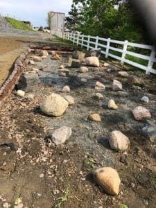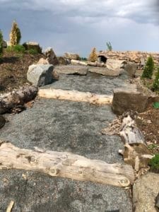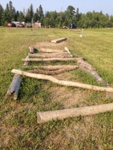 Lors d’une clinique de Mountain Trail, à Horseland au Québec, un superbe site avec une multitude d’obstacles très variés, le cheval devait se frayer un chemin parmi certains obstacles sans notre intervention, les premières fois en longe de 7 mètres. Ça implique le sens de proprioception de notre cheval. Quand c’est bien réussi avec la longe on a la permission de négocier le tout en selle sans gérer le cheval, donc rênes lâches et jambes inactives.