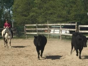 Pour moi où j’ai trouvé que Indy a le plus utilisé son jugement et j’ose dire son ‘’savoir faire’’ c’est lors des stages avec les vaches. Je ne connaissais pas ces jeux ni les vaches mais Indy a été élevée avec un troupeau de vaches pendant 4 ans; elle semblait savoir quoi faire. Le horseman qui nous a donné ces stages me répétait souvent ‘’n’interviens pas, Indy a du savvy avec les vaches et dès qu’elle comprendra la tâche à effectuer elle le fera très bien sans ton intervention’’. Il a été poli et n’a pas osé me dire sans ton entrave.