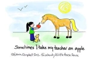 Ce cartoon illustre bien l’idée que notre cheval est aussi notre professeur et que nous devons l’honorer. Le cartoon comporte une erreur dans le texte, on offre et non on prend une pomme à notre professeur.