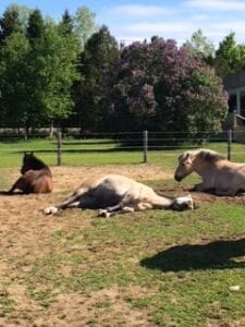 Je dis souvent à mes copines ‘’NE RIEN FAIRE C’EST EN RÉALITÉ FAIRE QUELQUE CHOSE, VOIR BEAUCOUP’’. Je dis toujours que ça met des points en banque car mes chevaux montrent souvent plus d’intérêt quand mon programme n’est pas ‘’chargé’’. S’asseoir dans le paddock et tout près et observer nos chevaux interagir entre eux. Nous avons installé des chaises à l’ombre à côté de mon paddock et on observe le troupeau interagir. Ça me surprend toujours de les voir si calmes; c’est très apaisant de les regarder.