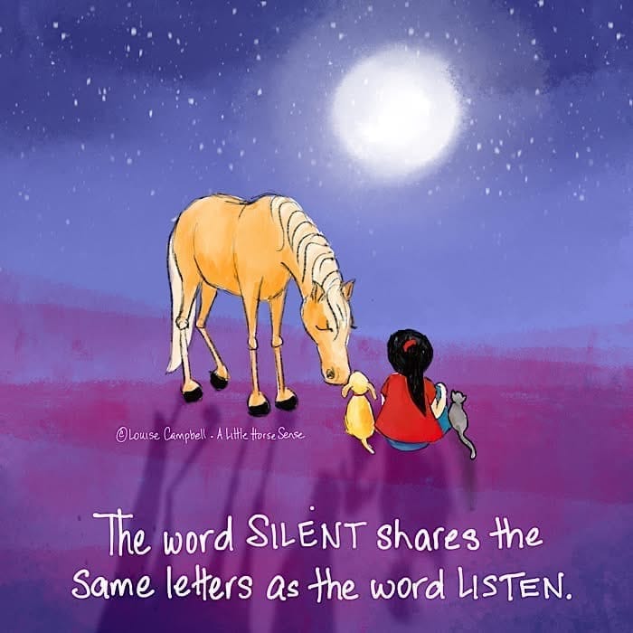 Alors je partage avec vous un ensemble d’idées pour vous stimuler à réfléchir sur ce sujet. Quand on travaille avec notre cheval demandons moins, diminuons nos attentes, utilisons moins de contact sur les rênes, moins de pression sur la longe ou via nos jambes. Pensons à la DOUCEUR de nos aides, notre cheval le ressentira.