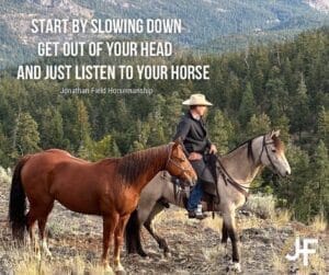 Cette phrase de Jonathan Field, horseman canadien fort réputé, m’a certes inspirée à écrire sur cet important sujet. Notre vie avec nos chevaux est souvent centrée sur des demandes, demandes et encore des demandes, des mouvements à accomplir et à RÉUSSIR! En plus nous sommes souvent pressés par le temps car nous avons autre chose à faire car notre cheval c’est notre loisir, pas notre travail à plein temps. Et comme on dit souvent, il faut travailler afin de se payer le luxe d’avoir un cheval.