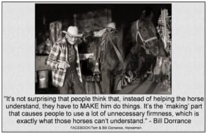 Bill Dorrance, horseman fort réputé nous l’a dit fort bien : ‘’C’est lorsqu’une personne précipite le progrès d’un cheval qu’elle est enclin à faire le commentaire que c’est un cheval ‘’problème’’.