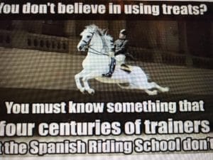 Traduction : Vous ne croyez pas en l’utilisation de friandises? Alors vous devez savoir quelque chose que les entraîneurs de l’École d’équitation espagnole de Vienne ne savent pas depuis 4 siècles.