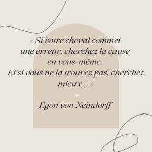 Certes que cet auteur nous amène à réfléchir quant à notre comportement et non seulement celui de notre cheval. Quand il parle de chercher la cause en nous même, il nous ramène à ce dont je parle plus haut soit de bien mettre CALMEMENT des balises claires afin que le cheval comprenne notre attente envers lui. Quand on regarde les bons horsemen/women ils sont d’un CALME OLYMPIEN. En leur présence les chevaux sont aussi calmes.