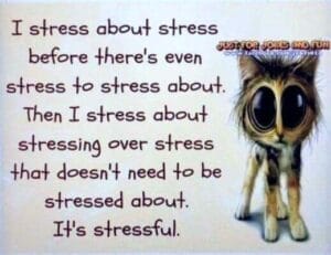 Cartoon : Je stresse à propos du stress avant même qu’il y ait quelque chose de stressant au sujet duquel je devrais stresser. Puis je stresse au sujet du fait que je stresse au sujet de sujets qui ne méritent pas que je stresse. C’EST STRESSANT !