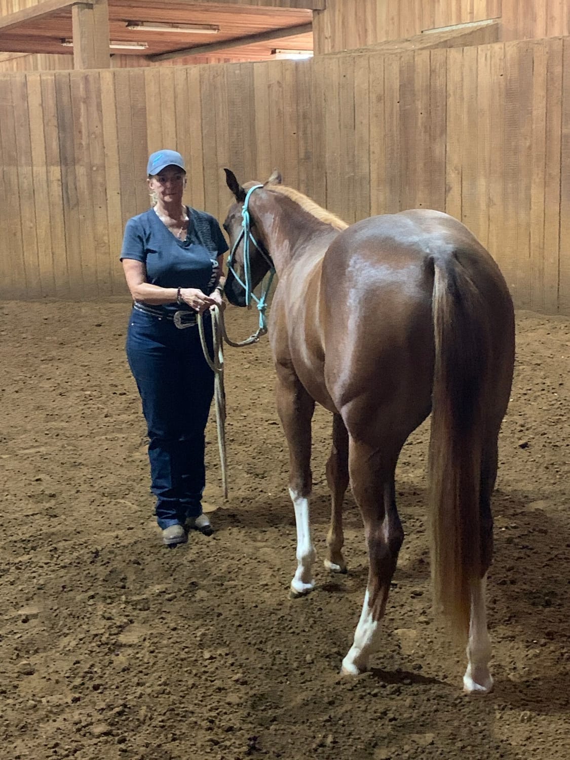 On voit ici Eve avec son jeune cheval qui travaille le recul pour la première fois près du mur lors d’un stage avec Lyne. ⏬⏬