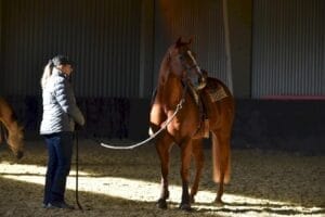 Je prends le recul comme exemple afin de démontrer d’une part l’importance du travail à pied afin de faciliter l’apprentissage chez notre cheval et d’autre part pour démontrer comment cet exemple sert pour plusieurs autres exercices. Que ça soit en équitation classique ou western le travail à pied est valorisé par les entraîneurs afin d’éduquer notre cheval aux divers mouvements.