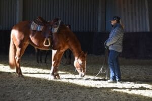 Premier prérequis avant de demander quoique ce soit à mon cheval c’est qu’il soit sur l’endorphine et non l’adrénaline. Si on demande à notre cheval de baisser la tête soit par pression sur la nuque ou le licol ou le toucher de la main ça le détend et il pense moins à la fuite. Il est ainsi capable de se centrer sur notre demande. L’article ‘’Comment vous connecter à votre cheval? de la série PARTENARIAT AVEC LE CHEVAL explique bien ce concept.