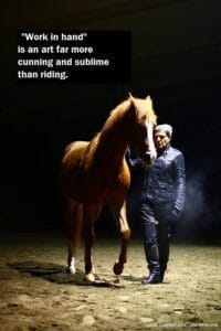 Sans parler de ceux qui font du travail plus avancé en main. Tel ce cavalier réputé Alexander Nevzorov qui dit que le travail en main est un art beaucoup plus rusé et sublime que la monte.