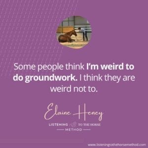 Je suis une inconditionnelle, de même que Lyne, du travail à pied pour éduquer notre cheval, développer notre connexion de même que pour peaufiner notre partenariat et notre communication. Je crois sincèrement qu’on ne fait jamais trop de travail au sol. Il nous faut toutefois rendre ça intéressant pour le cheval.